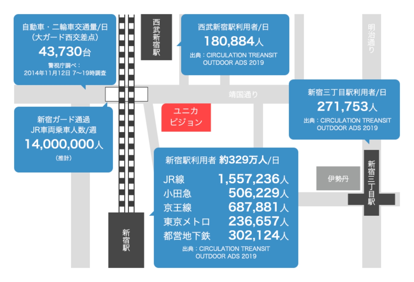 日本一の乗降客数の新宿駅。JRだけでも山手線・中央本線・中央線・総武線・埼京線・湘南新宿ライン・成田エクスプレスと複数の幹線があり、大ガードでは車両内からもユニカビジョンを視認できます。ユニカビジョン正面の西武新宿駅、新宿三丁目駅など様々な場所からの視聴者の確保が期待できる立地です。